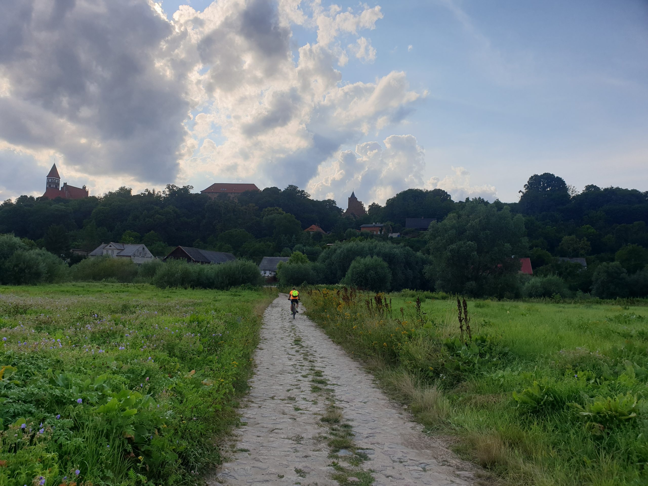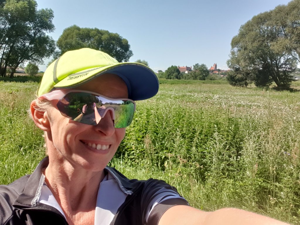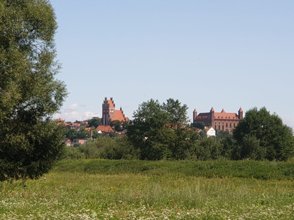 Po zapakowaniu potrzebnych rzeczy do sakw, wyruszyliśmy w drogę. Początek był falstartem. Zanim odnalazłam wyznaczoną trasę troszkę pozawracaliśmy. W końcu znaleźliśmy właściwą drogę, która zaprowadziła nas nad wał wiślany. Krajobrazy jak z pocztówki, w oddali widać Kwidzyń i fabrykę papieru. Słońce miło przygrzewało, wiatr zostawiliśmy nad morzem. Cudownie. Wał skończył się dość szybko, a droga zmieniła się w asfaltową nawierzchnię. W pewnym momencie po prawej stronie wyłonił się majestatyczny zamek w Gniewie. Musiał robić olbrzymie wrażenie w czasach, gdy na tych terenach był tylko on, a ludzie zazwyczaj mieszkali w chatkach i lepiankach. Jadąc, bezskutecznie wypatrywaliśmy kawiarni, czy też restauracji.