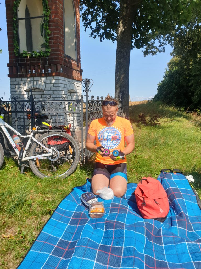 Po blisko 20 km, głodni zatrzymaliśmy się na drugie, no dla mnie na trzecie śniadanie. Miejsce niezbyt szczególne, zwykły kawałek pola z kapliczką przy drodze,  ale miejsce nie miało znaczenia. Ważne, że mogliśmy przygotować sobie kanapki i je zjeść w spokoju i ze smakiem. Dobrze, że zaopatrzyliśmy się w pasty warzywne z Lidla i chleb, gdyż inaczej bylibyśmy głodni. Jadąc na taką wycieczkę trzeba być samowystarczalnym. Doświadczenie pokazuje, że często nie ma żadnej restauracji w okolicy.